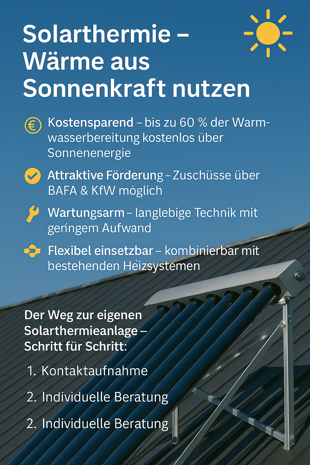 Nutzen Sie die Kraft der Sonne! Wir planen & installieren Ihre Solarthermieanlage – inkl. Beratung, Vor-Ort-Service & Förderung. Jetzt kostenlos informieren!