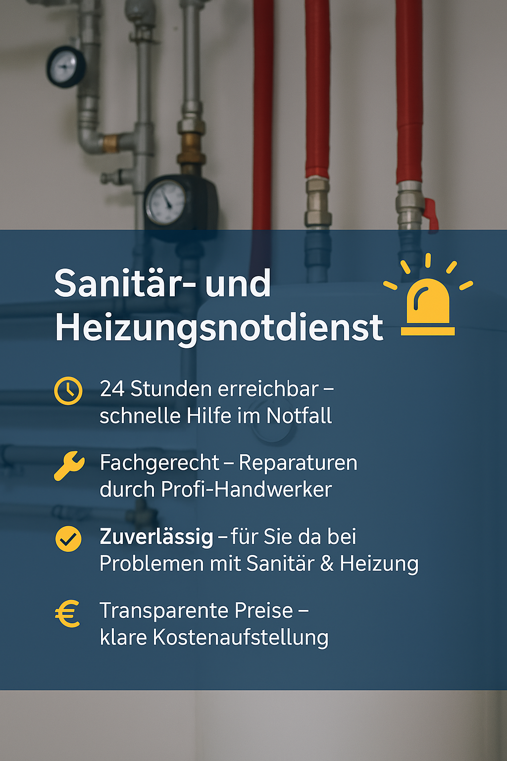 24h Heizungs- und Sanitärnotdienst – schnelle Hilfe bei Rohrbruch, Heizungsausfall oder Wasserschäden. Zuverlässig, fachgerecht und rund um die Uhr für Sie da!